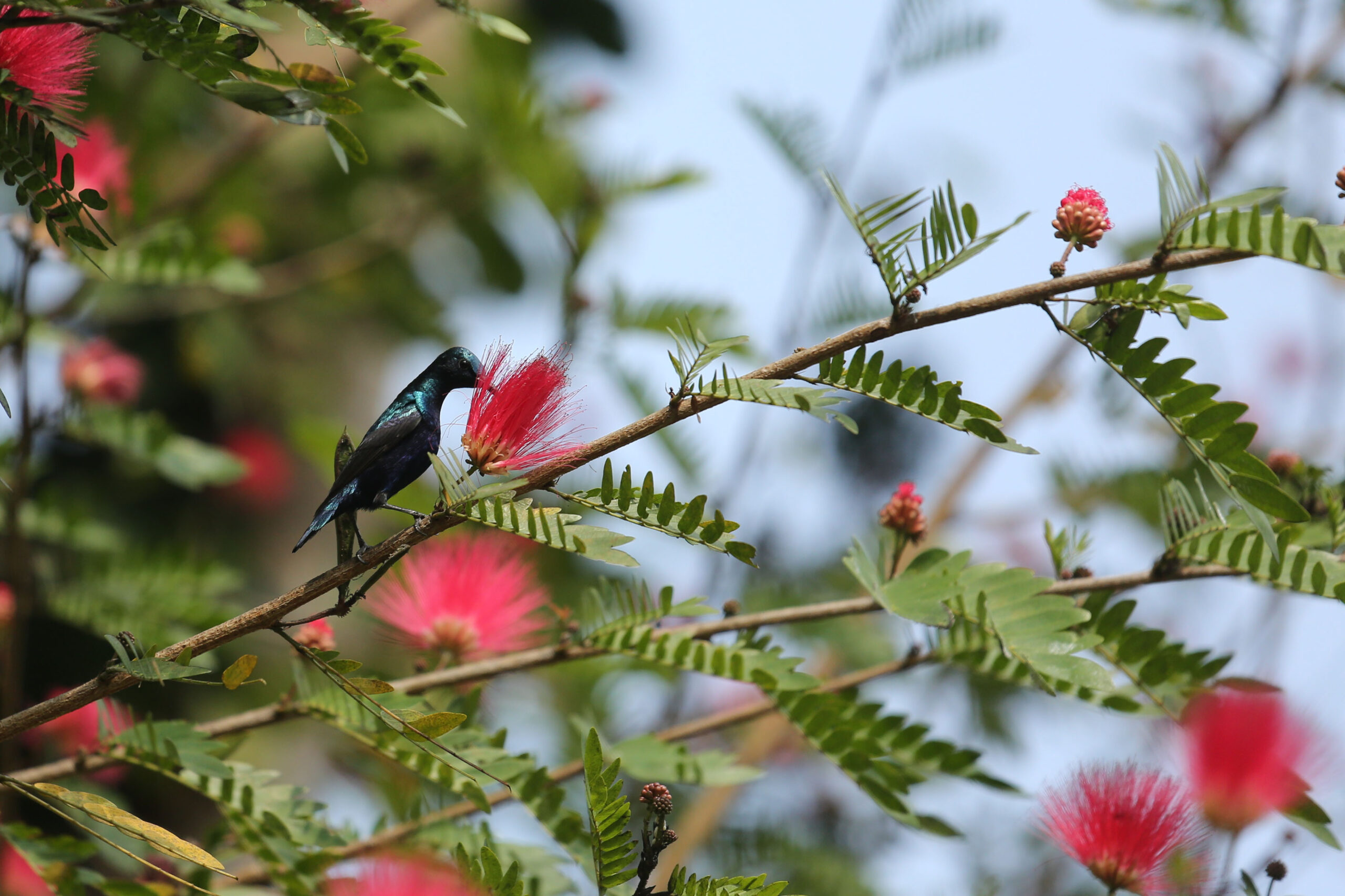 सुनसरीको इनरुवा नगरपालिका-४ मा फूलको रस चुस्दै गरेको भाले बुङ्गे चरा (पर्पल सनबर्ड)। प्रजनन समयमा आफ्नो रङलाई गाढा बैजनी र धातु जस्तै चम्किलो बनाउने यो चराले मुख्यतः फूलको रस र साना किराहरू खाई वनस्पतिको परागसेचनमा समेत मद्दत पुर्याउँछ। तस्बिर : नवीन गड्तौला/रासस