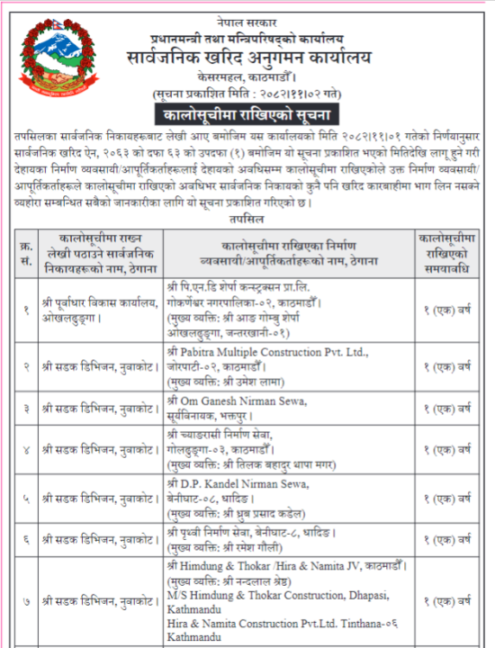 जिम्मा लिएको काम समयमै पूरा नगर्ने निर्माण कम्पनीलाई सार्वजनिक खरिद ऐन, २०६३ को दफा ६३ को उपदफा (१) बमोजिम कालो सूचीमा राखिएको सूचनामा उल्लेख छ। एक वर्षको लागि कालो सूचीमा राखिएका ती निर्माण कम्पनीले यस अवधिमा अब कुनै पनि खरिद कारबाहीमा भाग लिन पाउने छैनन्।