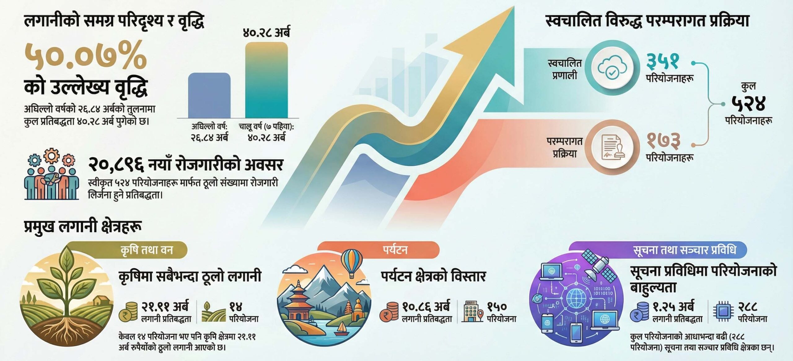 सरकारले यस अवधिमा कुल ५२४ परियोजनाका लागि ४० अर्ब २८ करोड रुपैयाँ बराबरको लगानी स्वीकृत गरेको छ, जुन गत आर्थिक वर्षको सोही अवधिको तुलनामा ५०.०७ प्रतिशतले बढी हो।