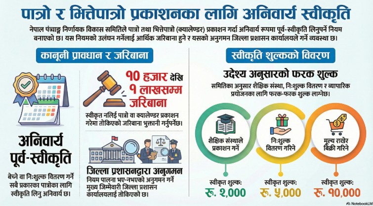 कार्यकारी निर्देशक पन्थीले पात्रो र भित्तेपात्रो प्रकाशन गर्ने सबै संस्था, कम्पनी, निकाय वा व्यक्तिलाई अनिवार्य रुपमा स्वीकृति लिनुपर्ने बताए। बेच्ने प्रयोजनको लागि प्रकाशन गरिएका र निःशुल्क वितरण गर्न लागिएका पात्रो वा भित्तेपात्रो प्रकाशनको लागि अनिवार्य रुपमा स्वीकृति लिनुपर्ने हुन्छ।