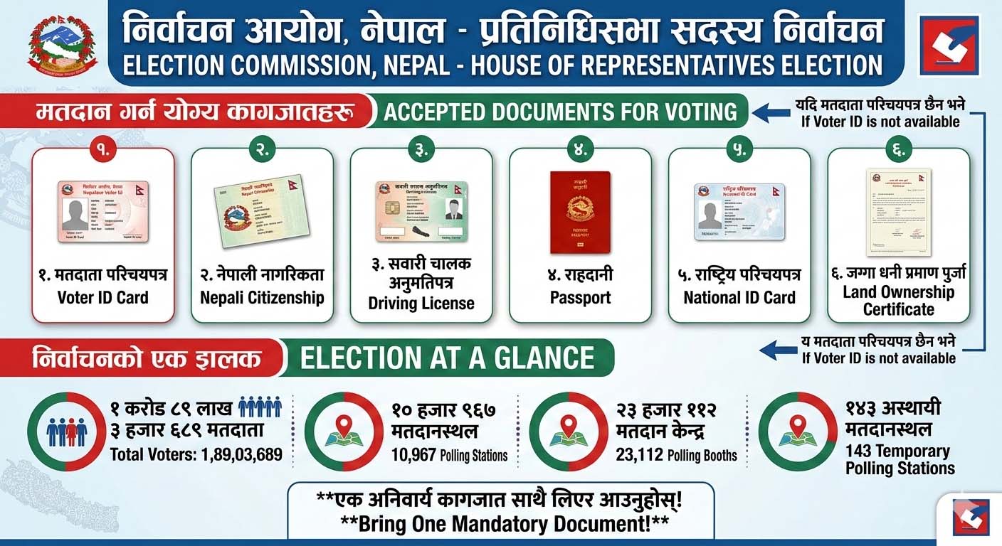 काठमाडौँ- बिहीबार हुने प्रतिनिधिसभा सदस्य निर्वाचनमा मतदान गर्न मतदाता परिचयपत्र वा त्यसको विकल्पमा अन्य पाँच प्रकारका कागजातका आधारमा मतदान केन्द्र प्रवेश गर्न सकिने निर्वाचन आयोगले स्पष्ट पारेको छ।