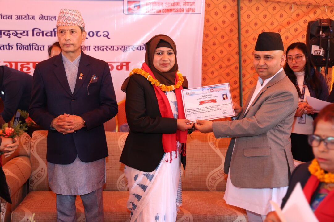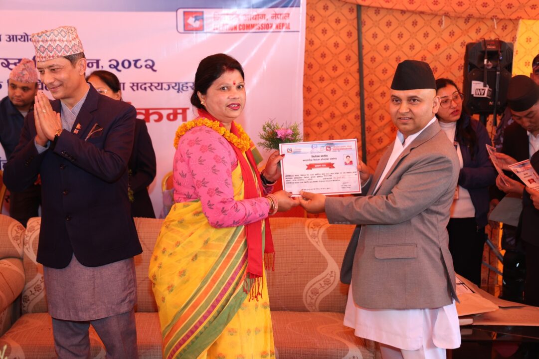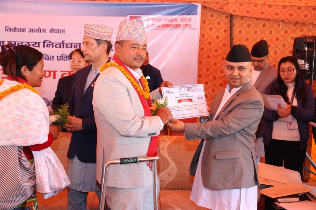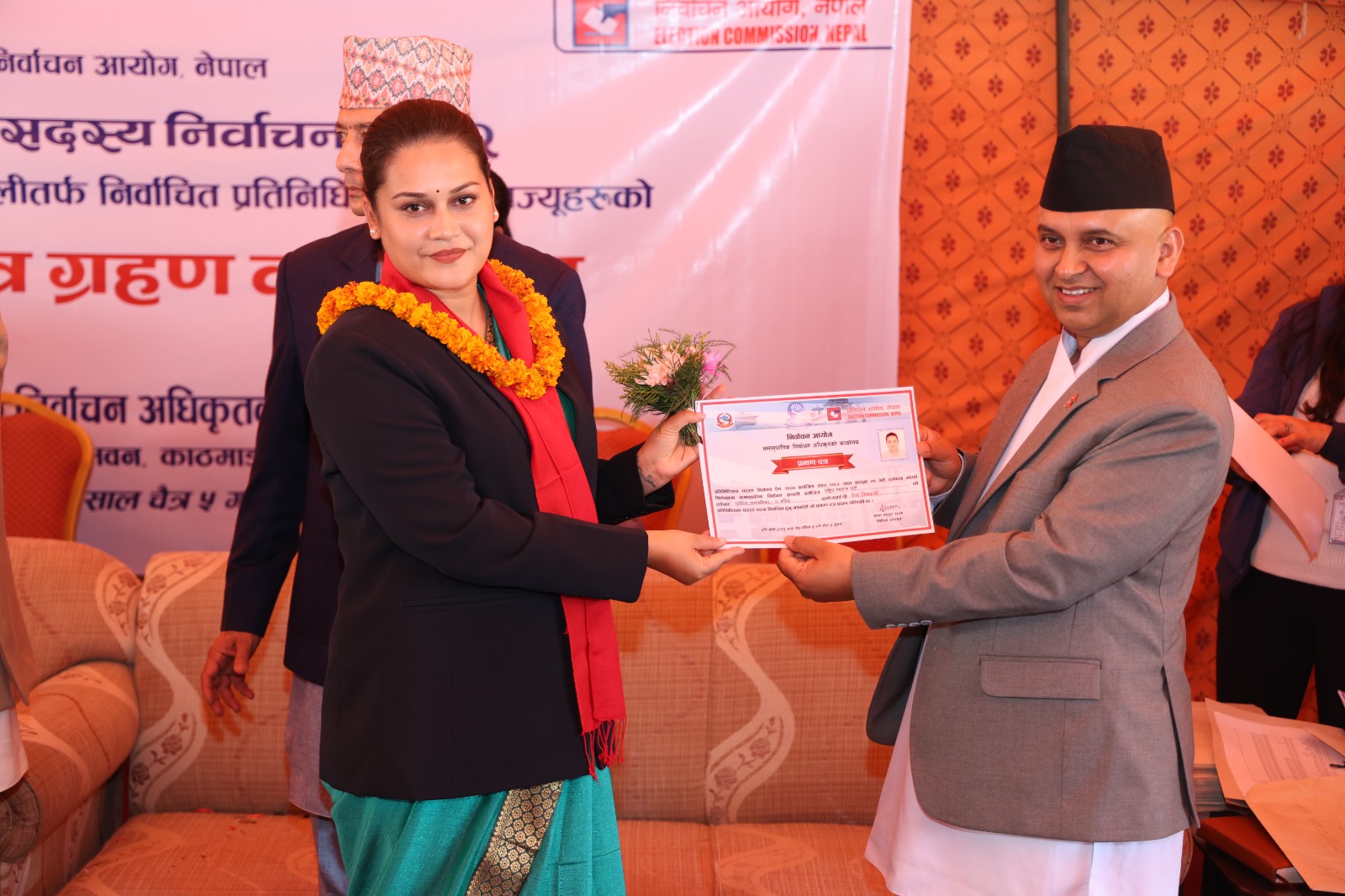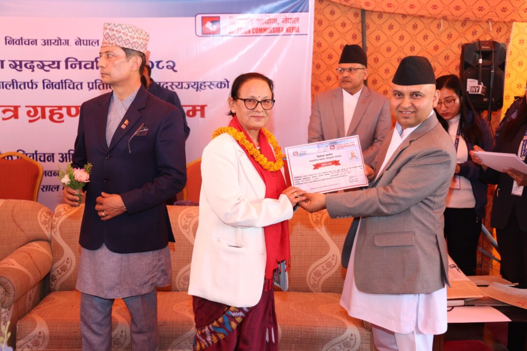 काठमाडौँ- निर्वाचन आयोगले गत फागुन २१ गते सम्पन्न प्रतिनिधिसभा सदस्य निर्वाचनमा समानुपातिक निर्वाचन प्रणालीतर्फ निर्वाचित ११० जना सांसदलाई प्रमाणपत्र वितरण गरेको छ।